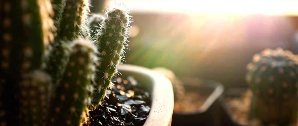 Os cactos são OS REIS do sol forte! Evoluíram em desertos para aguentar sol escaldante, temperaturas altíssimas e longos períodos sem água. Praticamente impossível de matar por excesso de sol.